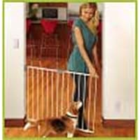 Very easy to use. But not too easy for my grandson. Not bad to install, love the option to have the gate open one direction. NO BAR to step over, so this gate is not a trip issue for older family members. We have three of these gates, the first was harder to install than the last and you can take it off the wall mounts easily if needed to move larger items through a doorway. It may not cover your widest hallway so measure prior to purchase.This gate is so much more convenient than the pressure-mounted gate I used before, especially being able to open and close it with one hand, and it won't fall down because it is mounted to the door frame. And since it doesn't touch the floor it doesn't scratch the floor. The gate only seems to open 90 degrees, which is fine for me because the room where the dogs are occasionally confined is at the end of a hallway, so the open gate lines up against a wall when hinged on the right. It is very convenient that you can choose whether to hinge it on either side. The gate width is also adjustable so it fits a range of door or walkway openings.The closing mechanism is slightly difficult because it requires you to lift the somewhat heavy gate up a bit and then set the end bar down into the groove on top of the opposite wall mount. The gate is attached to the fixed side by sturdy metal springs which provides the required "give" to lift the gate. However I think this simple approach will last longer than other designs, especially as the gate is made of metal. Time will tell!